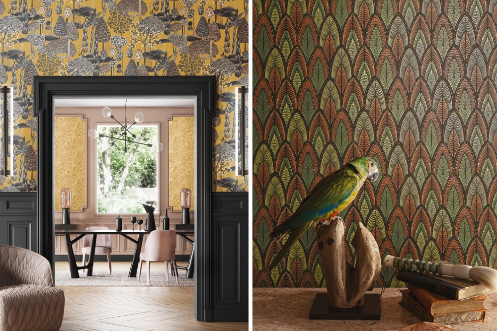 Till vänster: Med inspiration från indiska målningar, ger denna tapeten med blommor, blad och träd energi och massor av glädje till ditt hem. Till höger: Härlig värme och ombonad känsla med abstrakta blad.